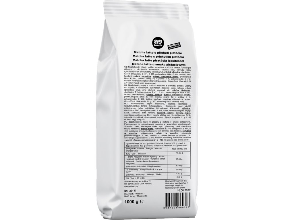 AG PRO Matcha latte s příchutí pistácie - Nealkoholický nápoj v prášku s matchou, s příchutí pistácie. Určený pro přípravu v nápojových automatech.